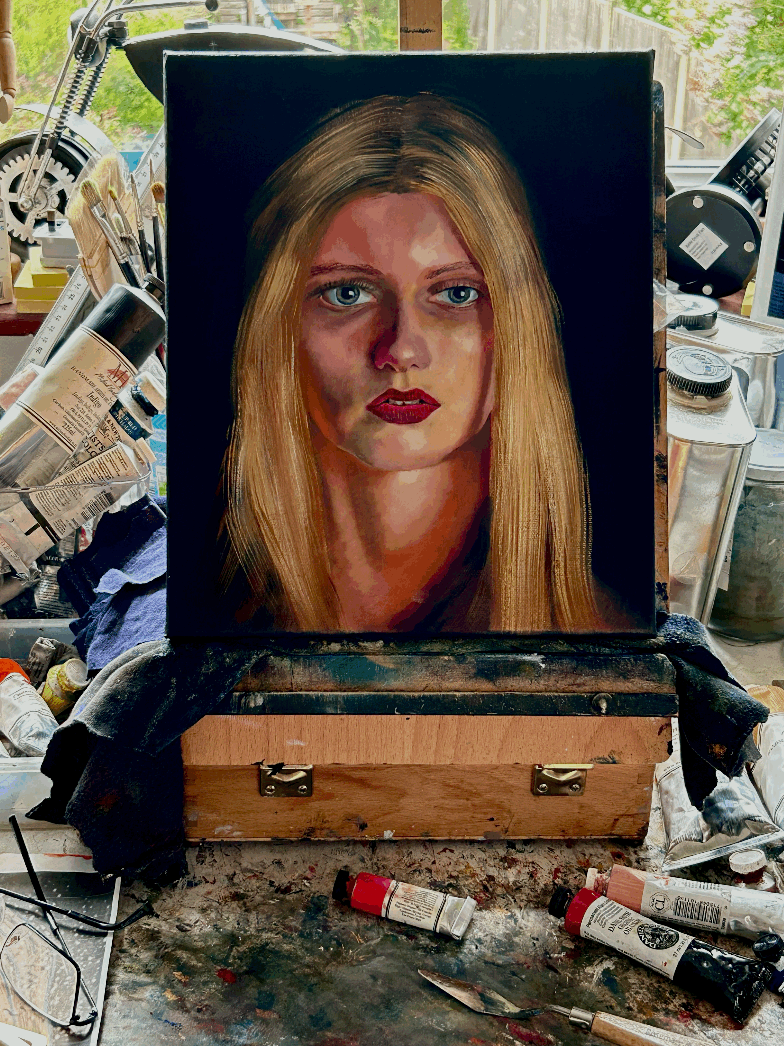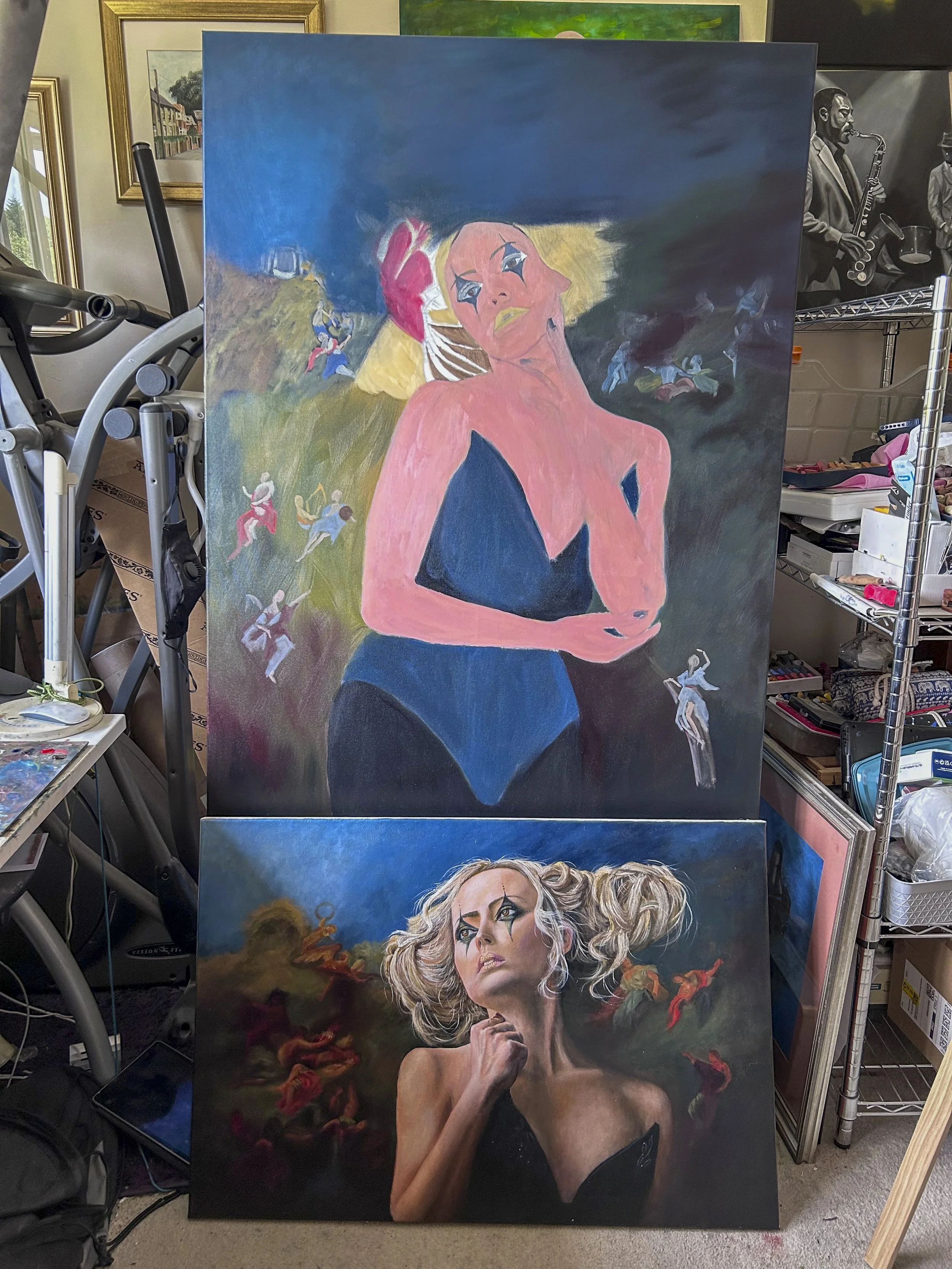 I am now working on a larger painting of girl with jester eyes. A slightly different background, this time.