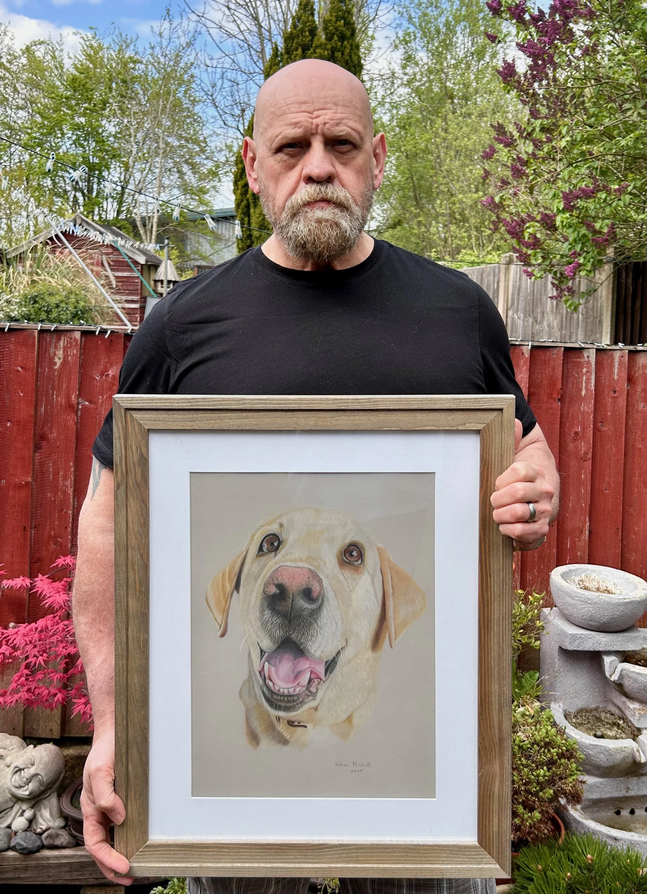 Our old golden Labrador, Millie. Drawn in Polychromos coloured pencils on drafting film. Framed and finished. Commissions of this size are currently a very reasonable £395 as of April 2025, unframed.