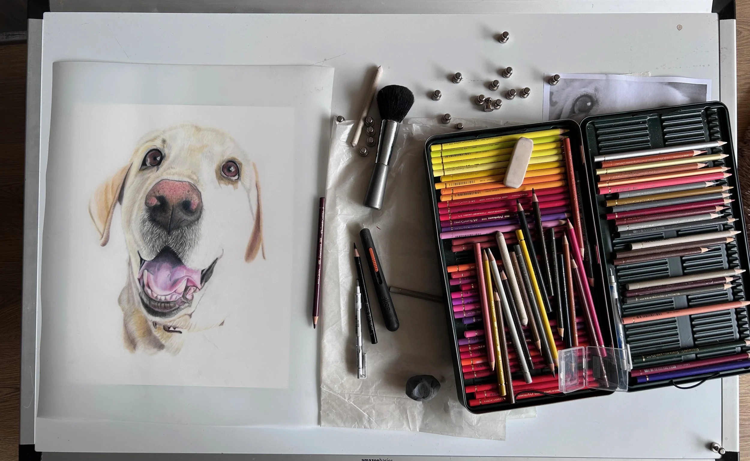 It’s been a while since I did some drawing so I am in the process of drawing Millie. Millie was our Labrador, who we sadly lost a few years ago. I am going to have a separate table at Belper Arts Trail 2025, where I will be offering commissions. This drawing is done on drafting film with top quality Polychromos pencils. Come to see me at Cocoa Cafe, Strutt Street, Belper 4th and 5th May 2025, or message me for details.
