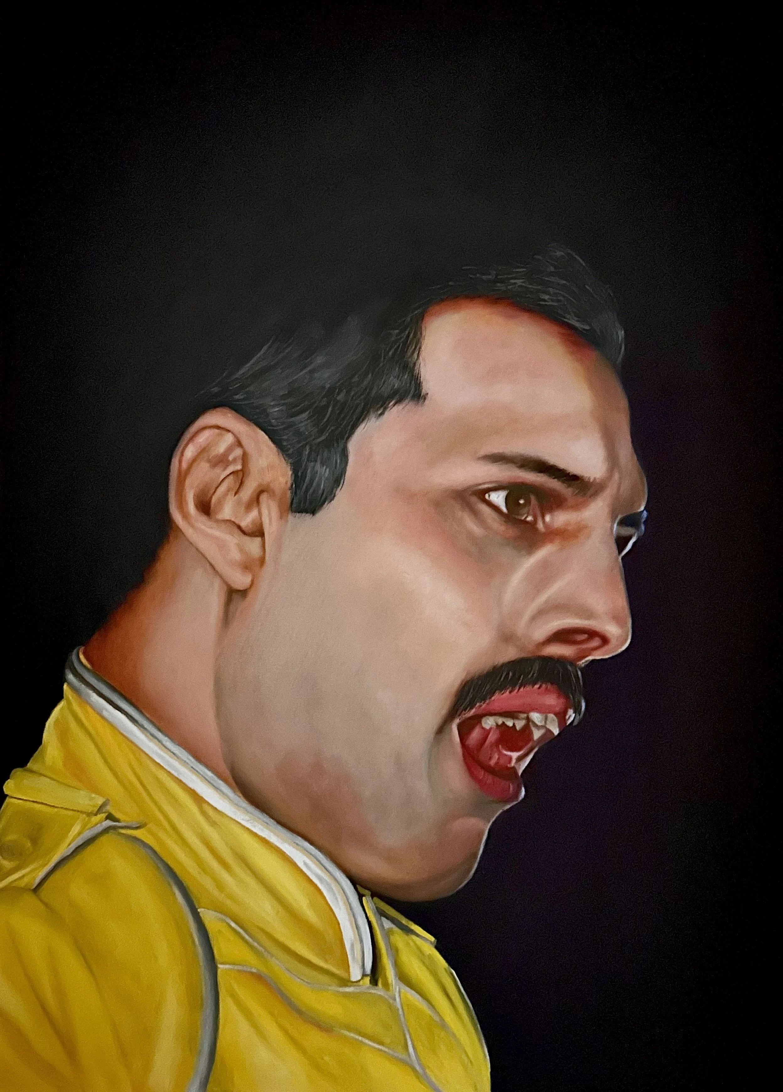 In 1986 I went to Wembley Stadium, London to see Queen, supported by Status Quo, INXS and The Alarm. This is an oil painting of Freddie Mercury in his famous yellow jacket from that “It’s a kind of magic” tour.